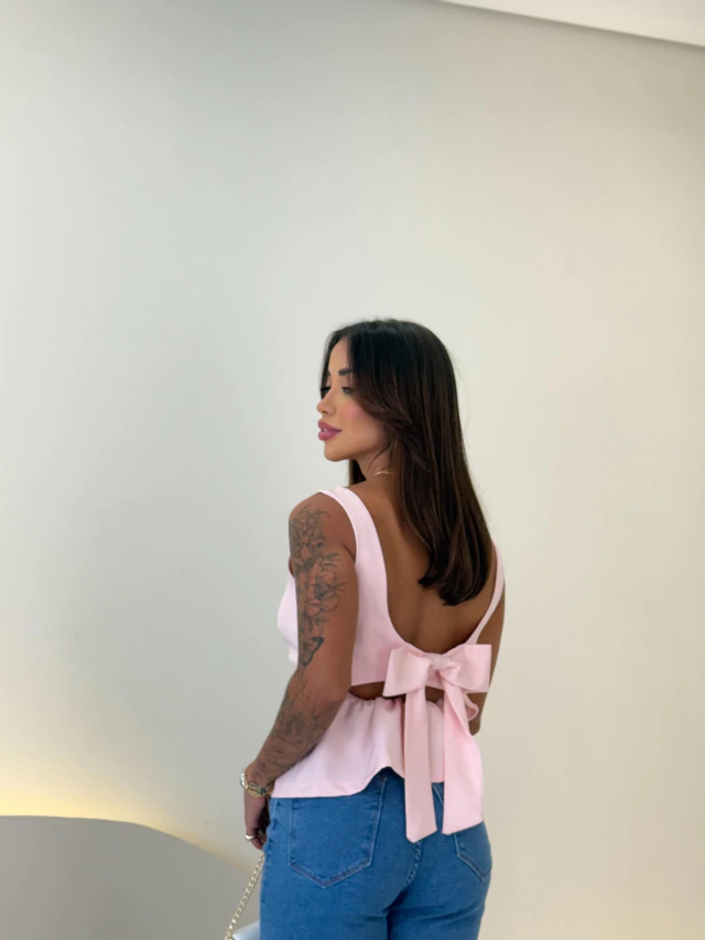 Um diferencial encantador está na abertura nas costas, que possui um laço minimalista. oferecendo ajuste perfeito e um toque de charme exclusivo à peça. Perfeita para combinar com calças, saias ou shorts, essa bata transforma seu look com um ar moderno e sofisticado.