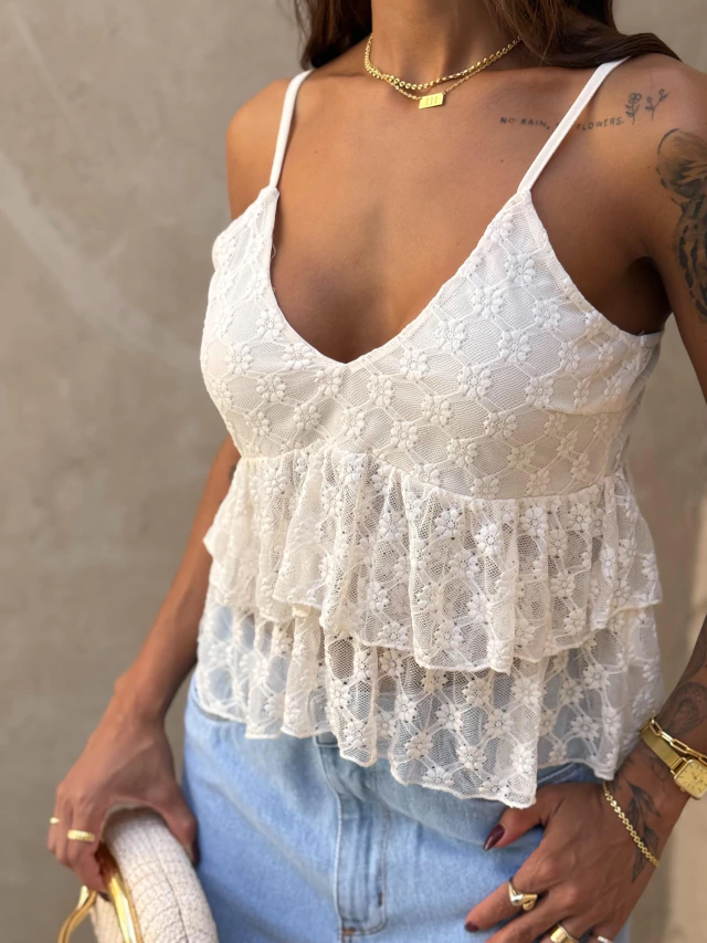 Características: - Material: Renda fina e delicada - Detalhe: Babado na parte frontal - Ajuste: Alça com regulagem para maior conforto - Versatilidade: Perfeita para compor looks casuais ou mais sofisticados