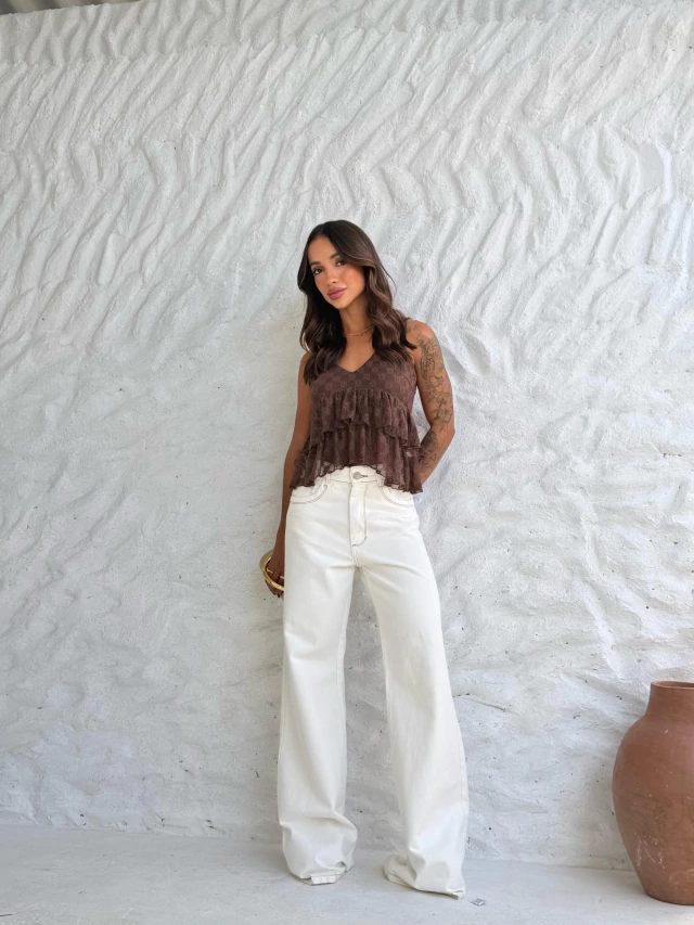 Confeccionada em renda de alta qualidade, a Blusa Renda Finesse traz um toque de sofisticação para o seu guarda-roupa. Seu design apresenta um babado elegante que valoriza o visual, enquanto as alças com regulagem garantem ajuste perfeito e conforto durante o uso.