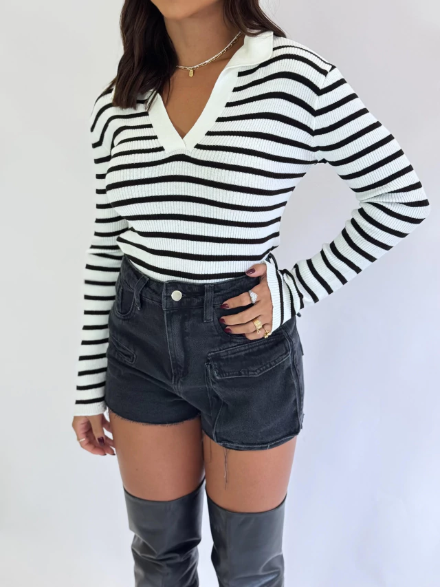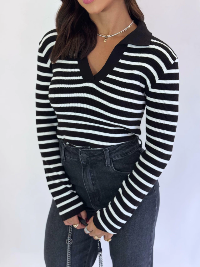 Descrição: A Blusa Canelada Mikayla é a escolha perfeita para quem busca conforto com estilo. Confeccionada em tecido canelado macio e durável, esta blusa apresenta gola com decote em V no busto, conferindo um toque de elegância ao visual. As mangas alongadas proporcionam um caimento sofisticado, enquanto as listras adicionam um detalhe moderno que complementa qualquer look.