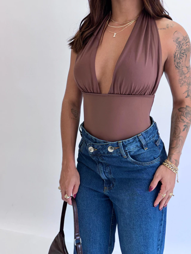 Tecido: Poliamida de alta qualidade Modelo: Body com decote cavado e amarração no pescoço