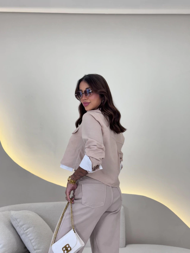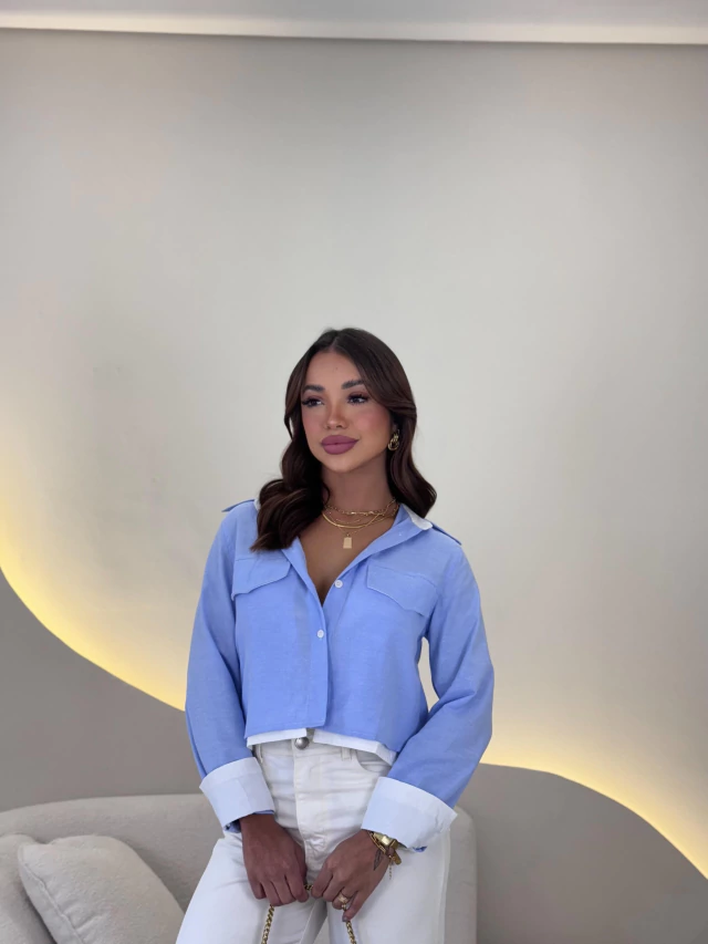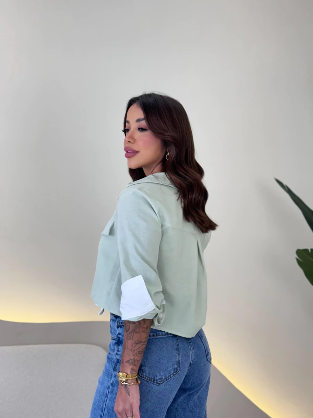Destaques do produto: - Tecido: Viscolinho, leve e confortável - Gola alta para um visual sofisticado - Fechamento por botões na parte frontal - Dois bolsos funcionais frontais - Mangas alongadas que valorizam o estilo cropped