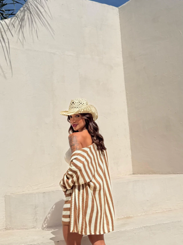 Kimono: Com modelagem alongada e mangas longas, o kimono oferece um caimento fluido e elegante. Seu design sem fechamento frontal proporciona um visual moderno e prático, ideal para diversas ocasiões.