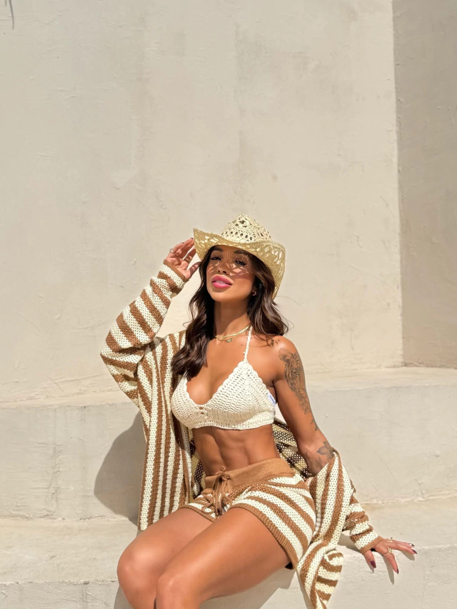 Shorts: Com modelagem mais curta, o shorts possui elástico na cintura com amarração, garantindo ajuste perfeito e conforto sem abrir mão da beleza.