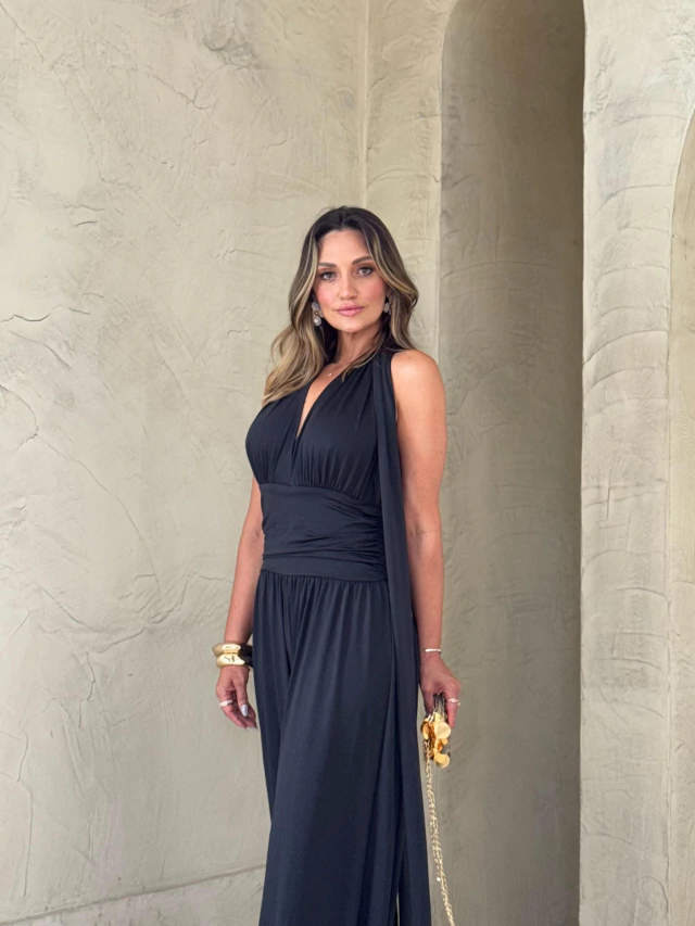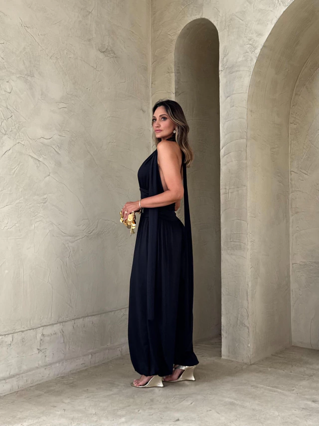 Este macacão apresenta amarração no pescoço que valoriza o colo e permite ajuste personalizado, além de um elegante decote em V no busto, que realça a silhueta com delicadeza. A calça possui uma modelagem aladim, famosa por sua fluidez e conforto, acompanhada de uma charmosa abertura nas costuras, que adiciona movimento e um toque diferenciado ao look.