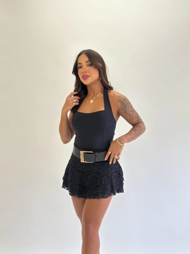 Descrição: A Saia Renda Bess é a escolha perfeita para quem busca elegância e conforto em uma única peça. Confeccionada em renda delicada, ela apresenta um design curto com dois babados que adicionam movimento e charme ao visual. A cintura média valoriza a silhueta, proporcionando um caimento harmonioso e confortável.